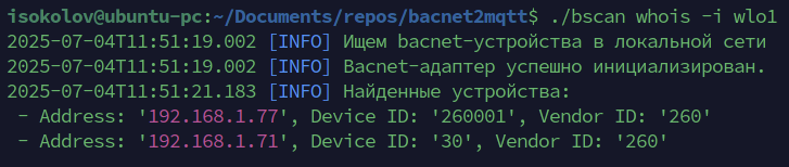 Bscan — это CLI-утилита, предназначенная для работы с bacnet-устройствами, позволяющая в полуавтоматическом режиме собрать данные из bacnet-устройств и подготовить их для формирования конфигурационных файлов для драйвера bacnet2mqtt.