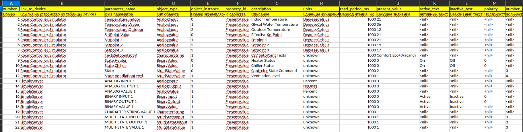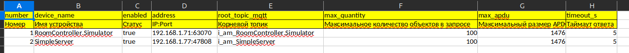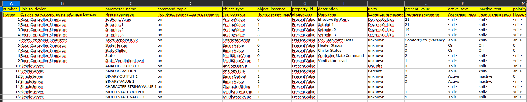 В нормальном режиме на стадии эксплуатации драйвер bacnet2mqtt должен использоваться только для опроса свойств PresentValue bacnet-объектов устройства, поэтому выходной файл формируется на опрос именно этого свойства, а вся сопутствующая описательная метаинформация прикладывается в дополнительных столбцах, на основе которой определяется необходимость в этом сигнале, его правильное именование и все остальное, что необходимо для вывода сигнала в Андромеду. Подробнее про формат таблицы смотри в документации РП. Автоконфигуратор YAML.
